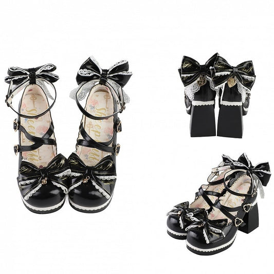 Design Bow Crisscross Polished Heels High Shoes Black Platform at Top Jirai Heart Block Buckles Kei