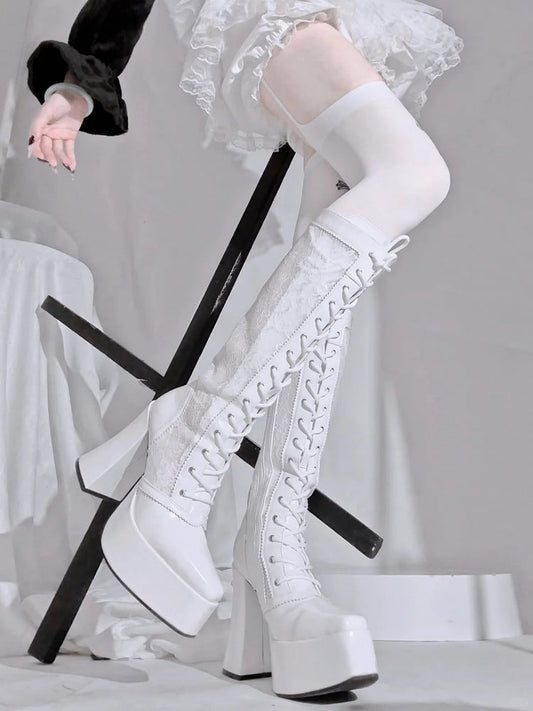 Gothic White Front Lace-up Ties Lace Platform High Block Heel Knee-high Boots