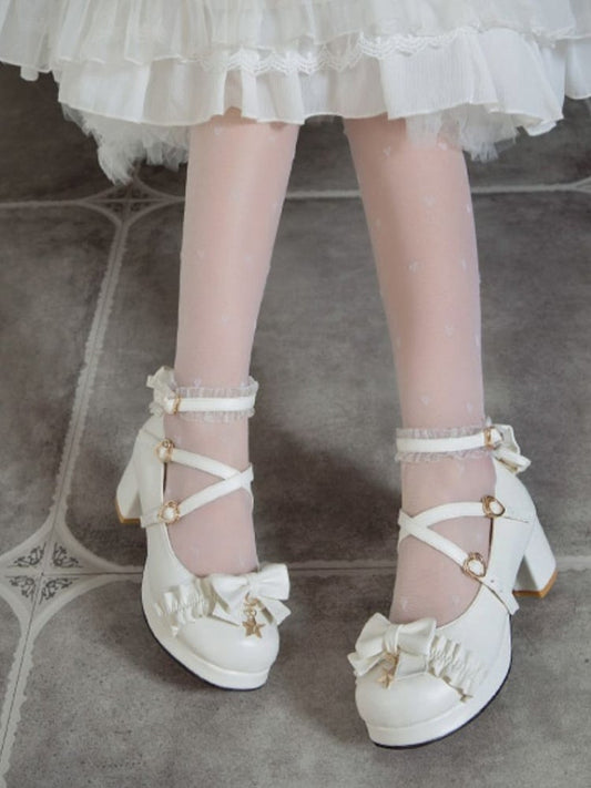 Block Heels with Charm Star Heart White Trim Buckles Lolita Ruffles Top Mid Bow