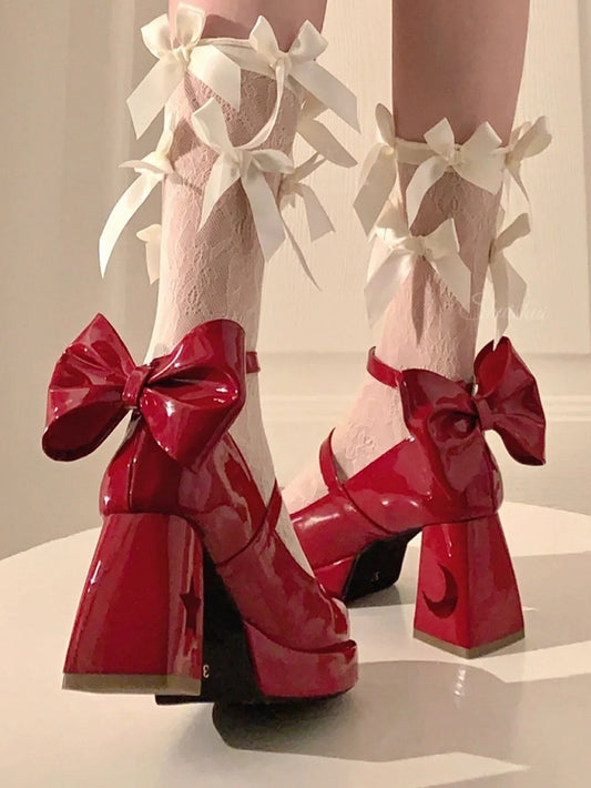 Buckles Decorative Starry Jane Shoes and with Back Wine Night Star Y2K Platform Moon Red - Mary Bow