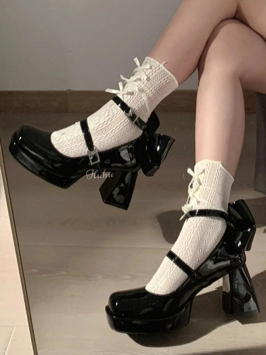 Block Knotted Sweet Bow Jane Heel Lolita 6cm - Black with Mary Shoes