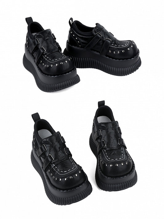 Black Velcro Strap with Design Details Studded Platform Closures - Shoes Punk
