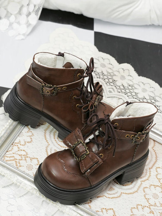 Brown Fleece Lined Bow Accent Platform Ankle Boots