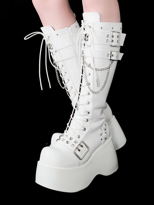 Bone-shaped Metal Plates Matte White Punk Wedge Platform Knee-high Boots