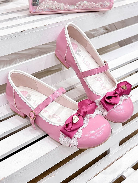 Elegant Rose Pink Lolita Low-heel Mary Janes - Heart Accent Bow, Lace Edging & Circle Buckle