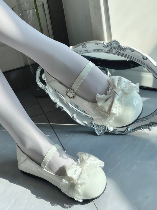 Round Toe White Mary Jane Flats - Dot Print Bow Accent, Lace Edging & Rhinestone Heart Closure