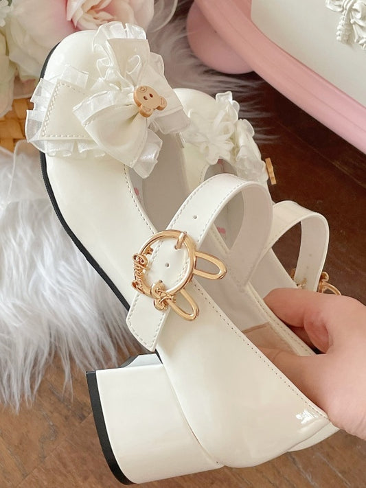 Bow Sweet Bunny-shaped Trimmed - Lace Mary Janes Toe Heeled 5cm White Round Fastener Decor Bear