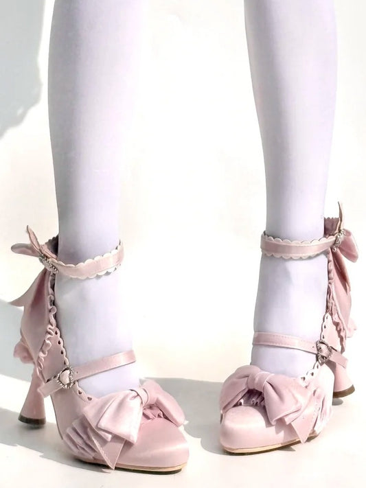 Ruffle High-heel in Decor Bows Accents Scalloped Elegant Mary Trim Jane Lolita Shoes Satin Pink