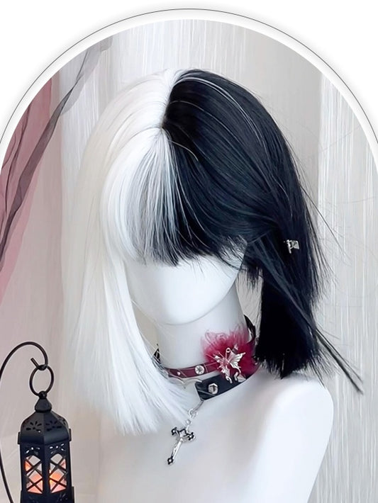Black&White Split Color Shoulder Length Straight Synthetic Wig With Bangs