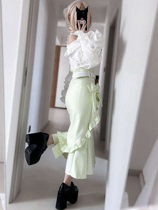 Skirt Bowknot Jirai Trim Green Decorated Mermaid Ruffles Kei