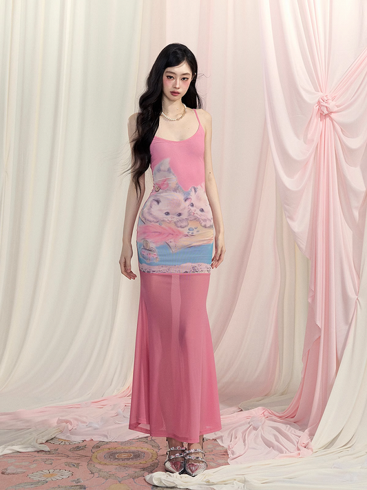 Pink Cute Cat Print Bodycon Skirt Slip Dress Mermaid
