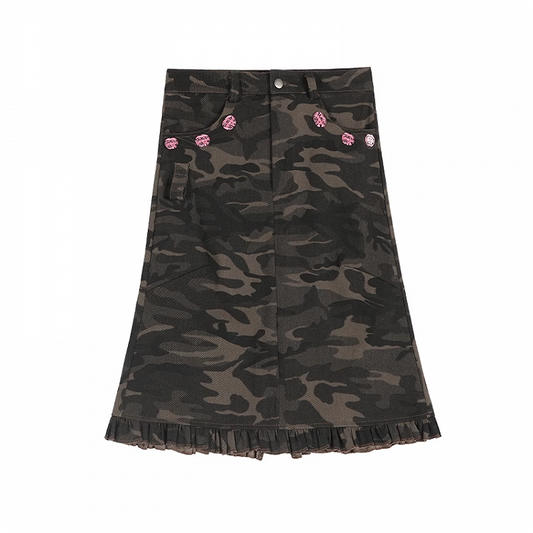 Waist Vintage Ruffle Hem Denim Mermaid Skirt Camo Low