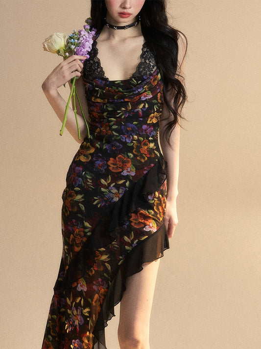 Floral Dress Skirt Black Chiffon Halter Neck Asymmetrical Mermaid