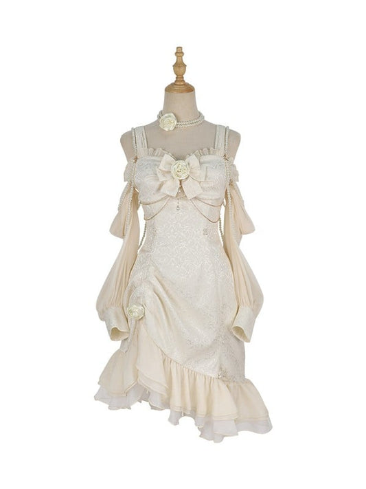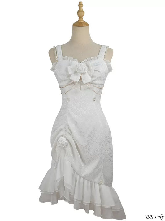 Rose Decoration Jacquard Hemline Mermaid Detail Ruffle JSK White Lolita Bead Camellia
