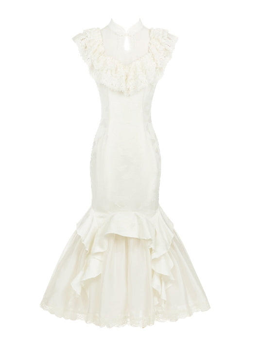 Ruffle Mermaid Butterfly Jacquard Trim Dress Qi Qipao Lolita Cascading Collar