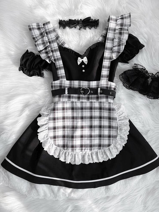 Shoulder Piece Lolita Maid One Set Cutout + Plaid Black Apron