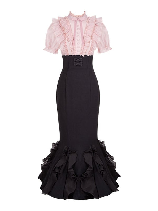 Mermaid Lolita and Boned Design Elegant Pieces Dress Pink Waist Blouse Two Fake Black Skirt