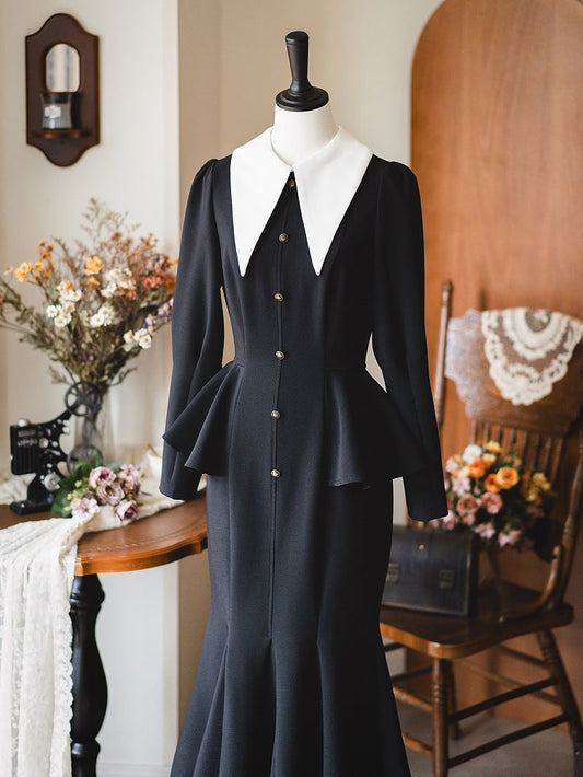 Black Retro Pointed Collar Elegant Office Lady Mermaid Dress