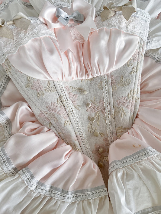 White and Pink Sweet Maid Apron + Basque Waist Tiered Ruffles Hem Strapless Puffy Dress