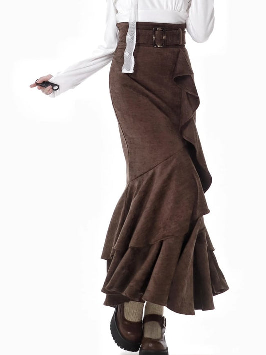 Coffee High Waist Flounce Hem Mermaid Skirt