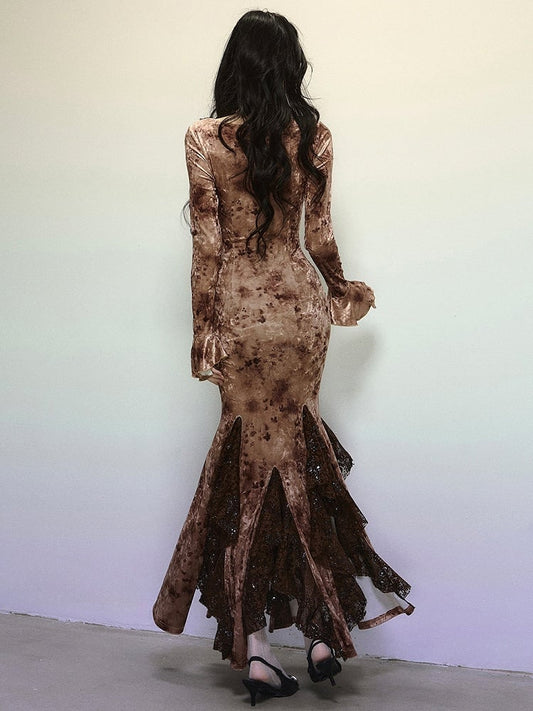 Coffee Sequins V-neck High Waist Lace Patchwork Flounce Mermaid Skirt Velvet Dress Evening Gown