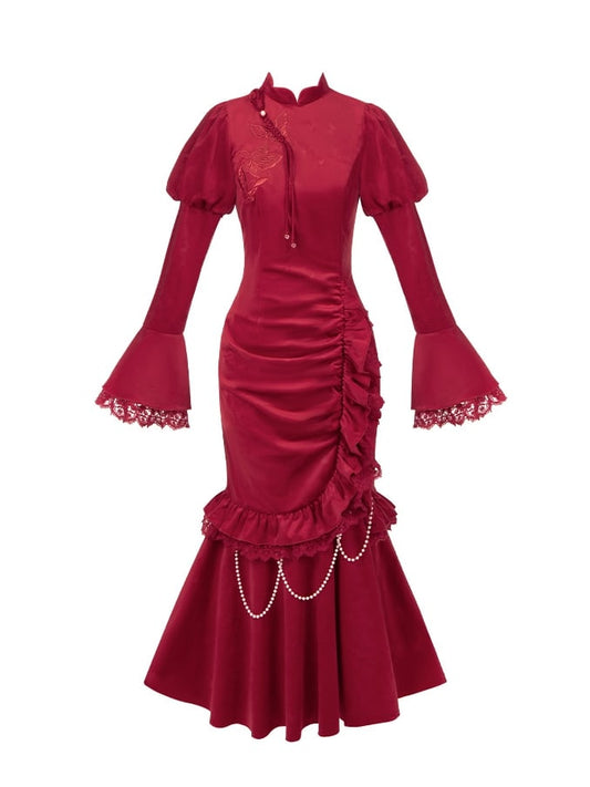 Red New Year Butterfly Mermaid Hem Qipao with Removable Bead Chain