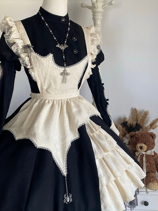 Black Curved Spider Web Hem Dark Maid Lolita Dress with Beige Apron