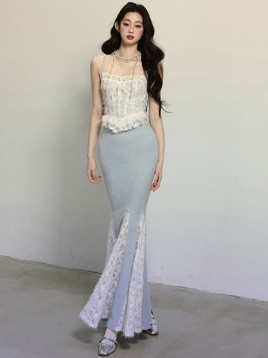 Blue Crochet Lace Corset Bodice Lace Patchwork Mermaid Skirt Maxi Dress
