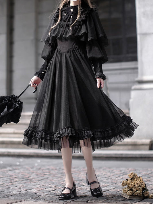 Dot All-Black Dress Cape Kuro Lolita with Dark Elegant Design Tulle