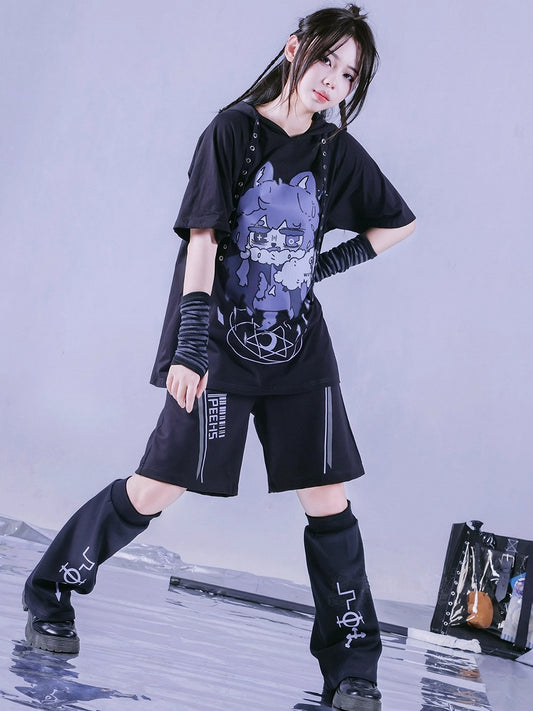 Wolf Cartoon Ears Drawstrings Black with Print and Hooded T-Shirt Strap