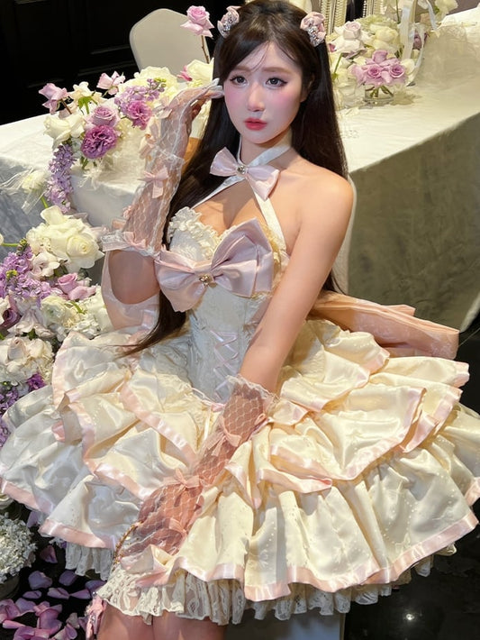 Creamy Bowknot Fabric Tiered Puffy Skirt Halter Neck Birthday Corset Dress