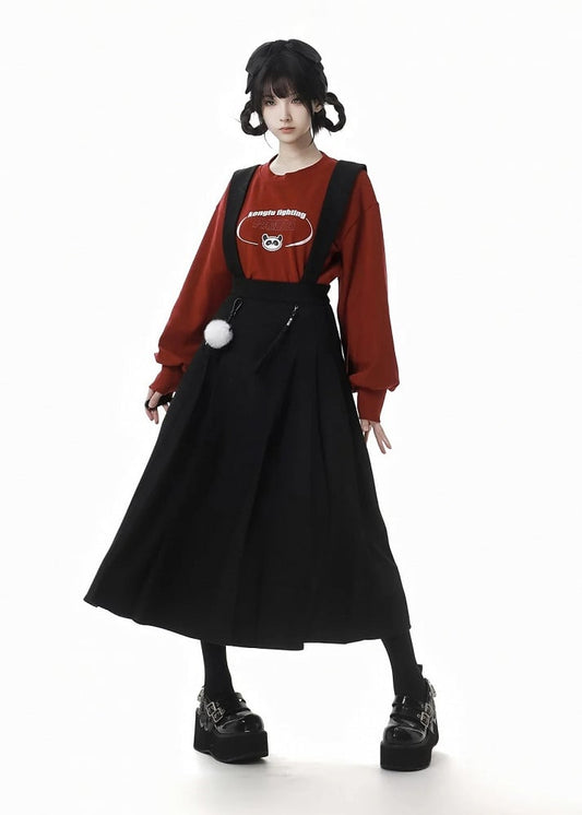 Black Detachable Shoulder Straps Overall Woolen Midi Skirt Asymmetrical Hem