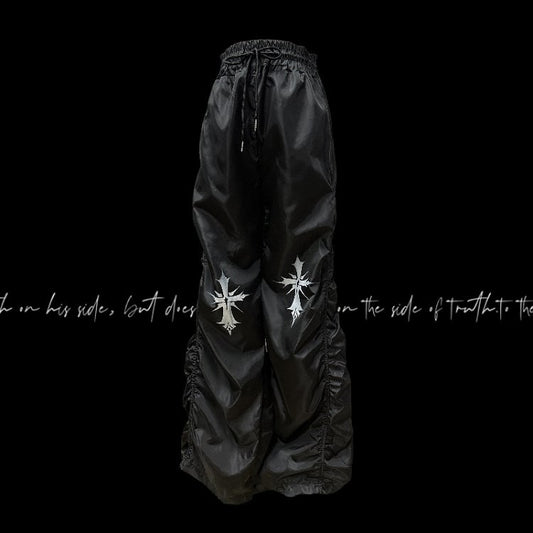 Waist Cross Print Design Drawstring Black Ruched Casual Pants