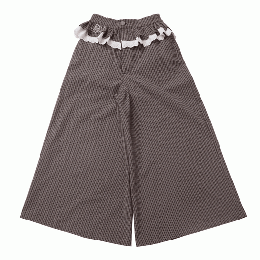 Ruffled Lace Trim Waist Wide-Leg Pants Brown Plaid