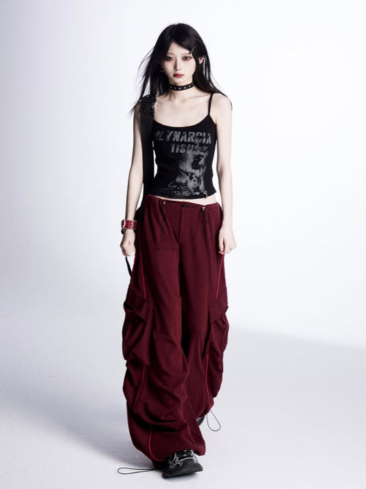Waist Drawstring Cuffs Wide-Leg Cargo Pants Red Low
