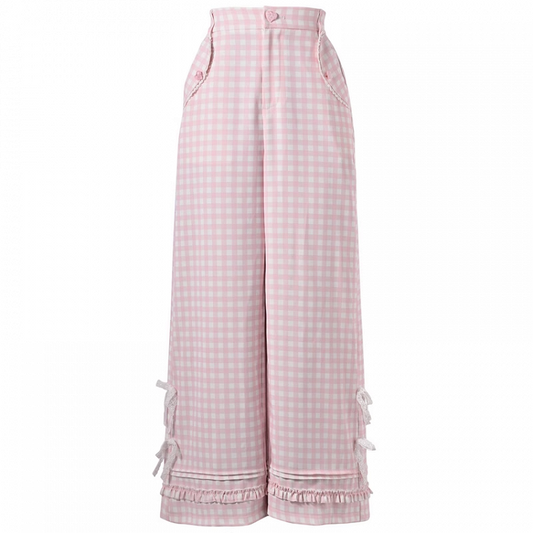 Pink Plaid High Waist Lace Bowknots Wide-Leg Pants Version Regular/Short