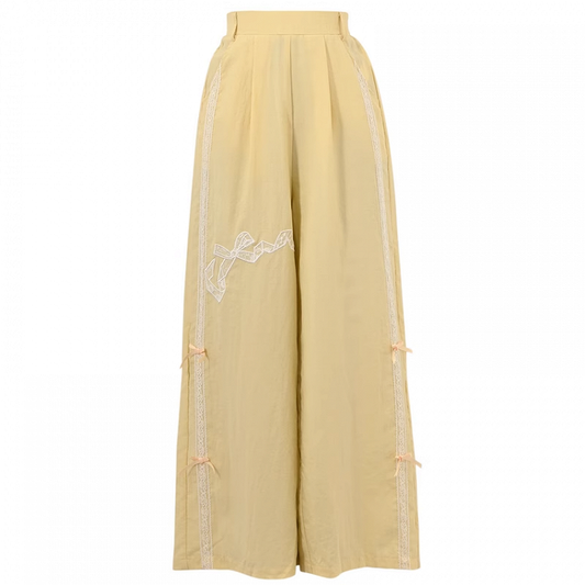 Bowknot Embroidery Wide-Leg Pants Yellow Regular/Short Version Waist High