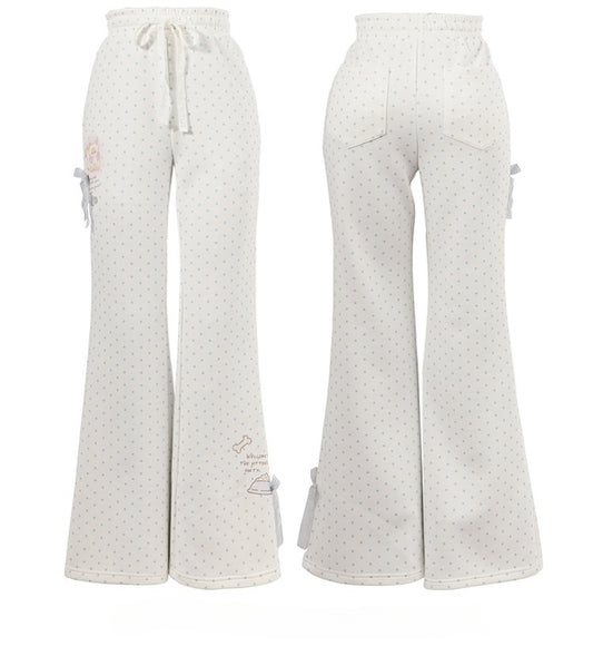 Flared Pants Polka-Dot Lace Bow Adorable Kitten Print Version Regular/Long Pink White