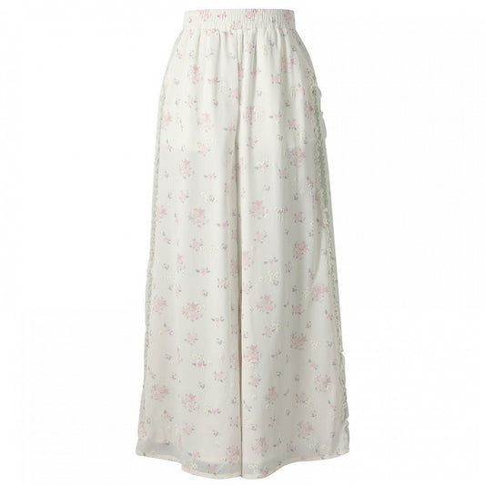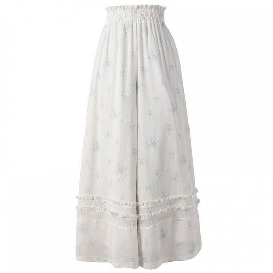 Short/Regular Lace Trim Wide-Leg Pants Floral White Elastic Waist Ruffled Version