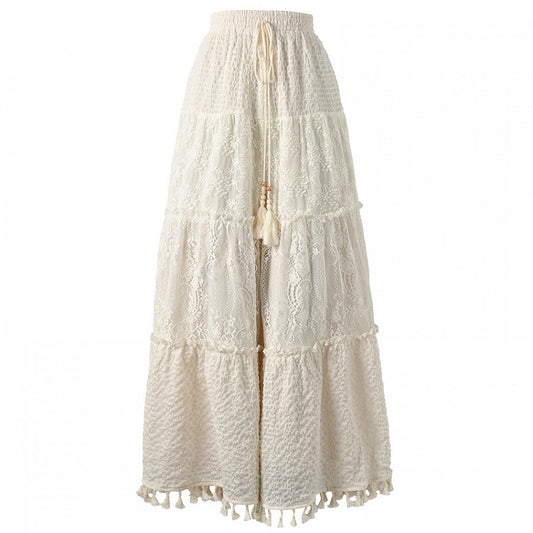 Waist Version White Drawstring Regular/Short Wide-Leg Pants with Tassel Cuffs Hollow-out