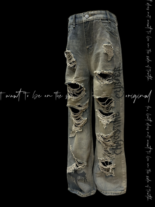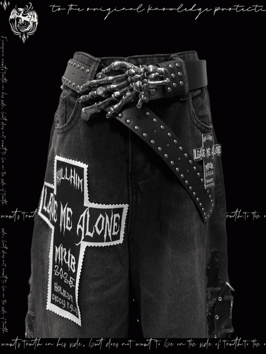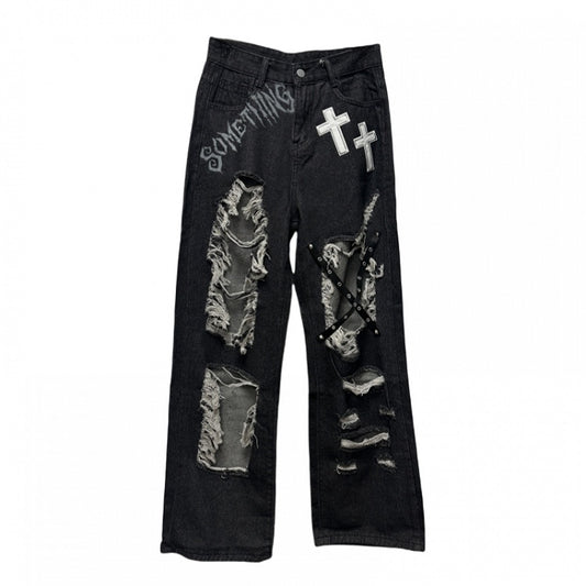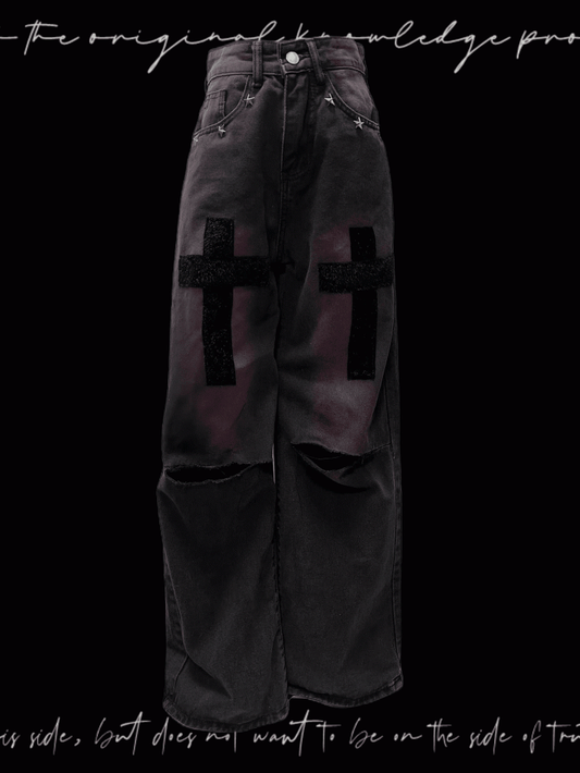 Y2K Cut Jeans Wide-leg Rock Punk Dark Gray Cross Applique Distressed Holes