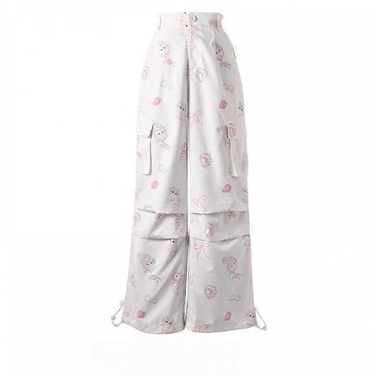 Cuffs Adorable Kitty Print Cargo Pockets Drawstring White Wide-Leg Pants