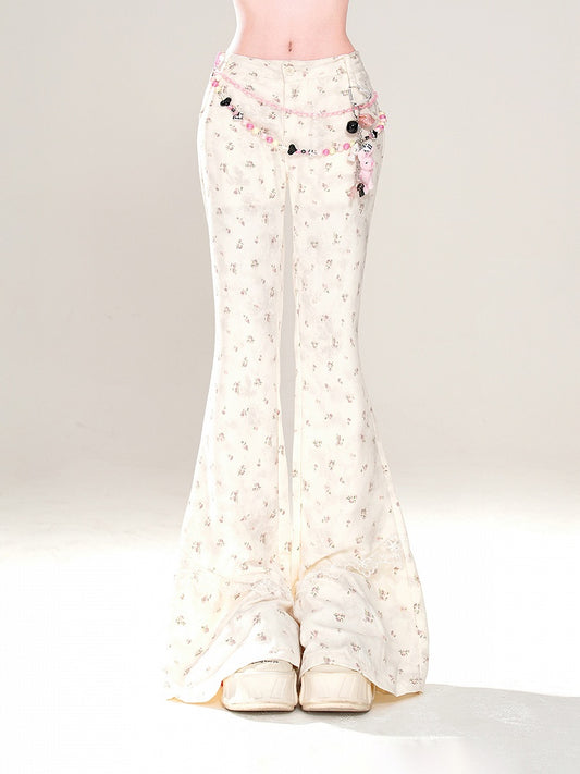 Apricot Low Waist Floral Pattern Slim-fitting Flared Pants
