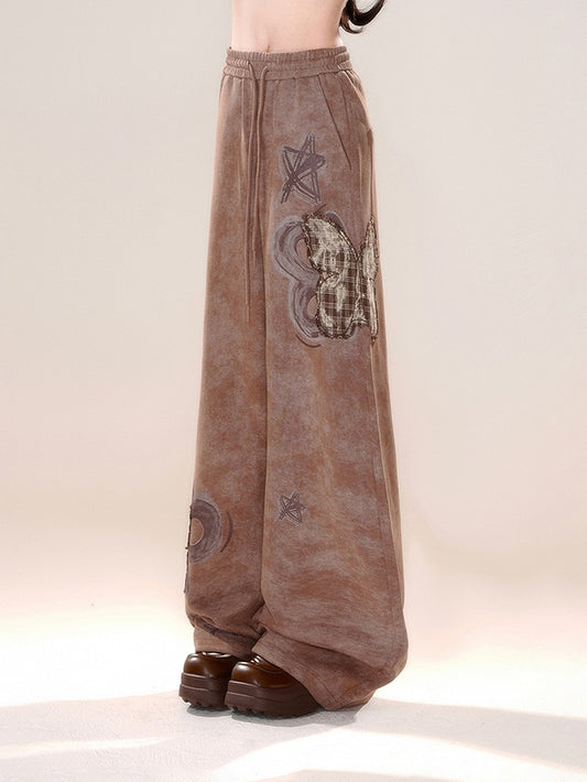 Wide-leg Applique Plaid Cut Brown Butterfly Pants