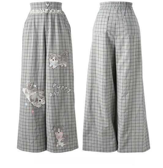 Regular/Short Lace Grey Plaid Puppy Print Heart Button Version Wide-Leg Pants Trim