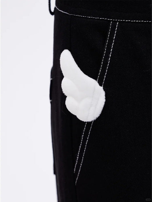Self-tie Strap Design Wings Cargo Pocket Wide-Leg Jeans with Black Angel