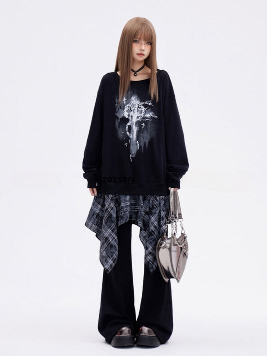 Vintage Wide-leg Grey/Red Plaid Wash Distressed Faded Punk Holes Jeans