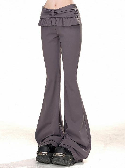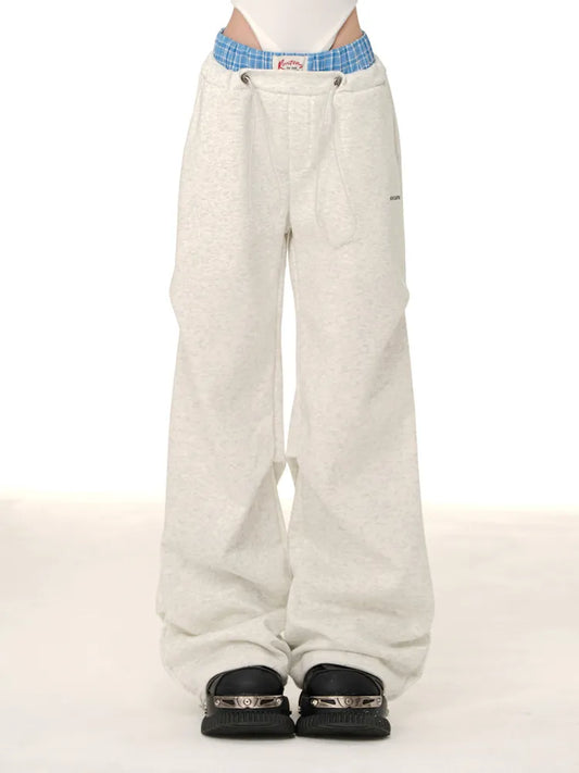 Gray Elastic Waist Lace Wide-Leg Drawstring Sports Pants Waist