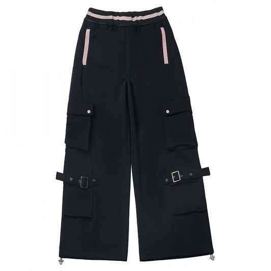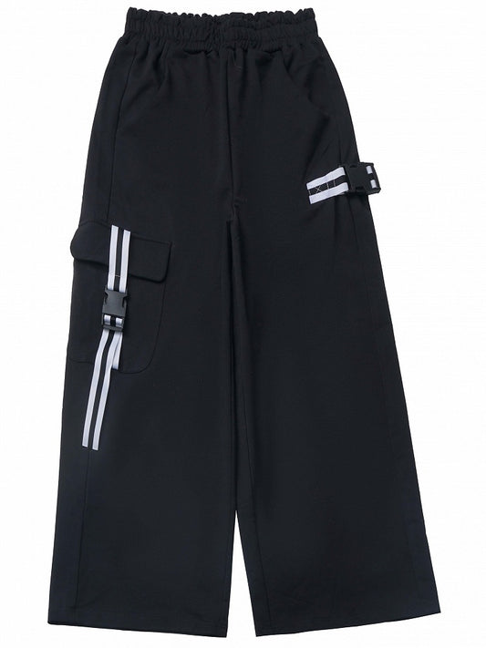 Loose Straight-Leg Pants Pockets Black Drawstring Waist Cargo