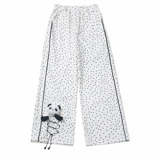 White Polka-Dot Pattern Cotton Straight-Leg Pants with Panda Plushie